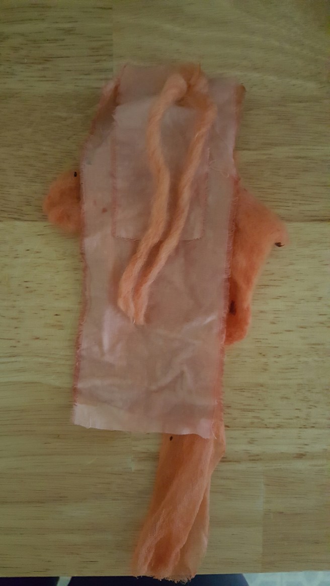 Each swatch had a piece of cotton with no mordant, cotton with an alum and cream of tartar mordant, cotton with a tannin mordant, silk with an alum mordant, roving with an alum and cream of tartar mordant and yarn with no mordant.