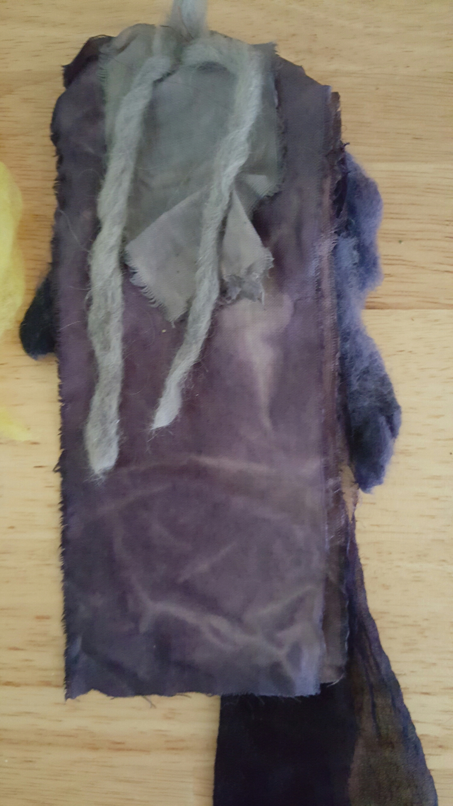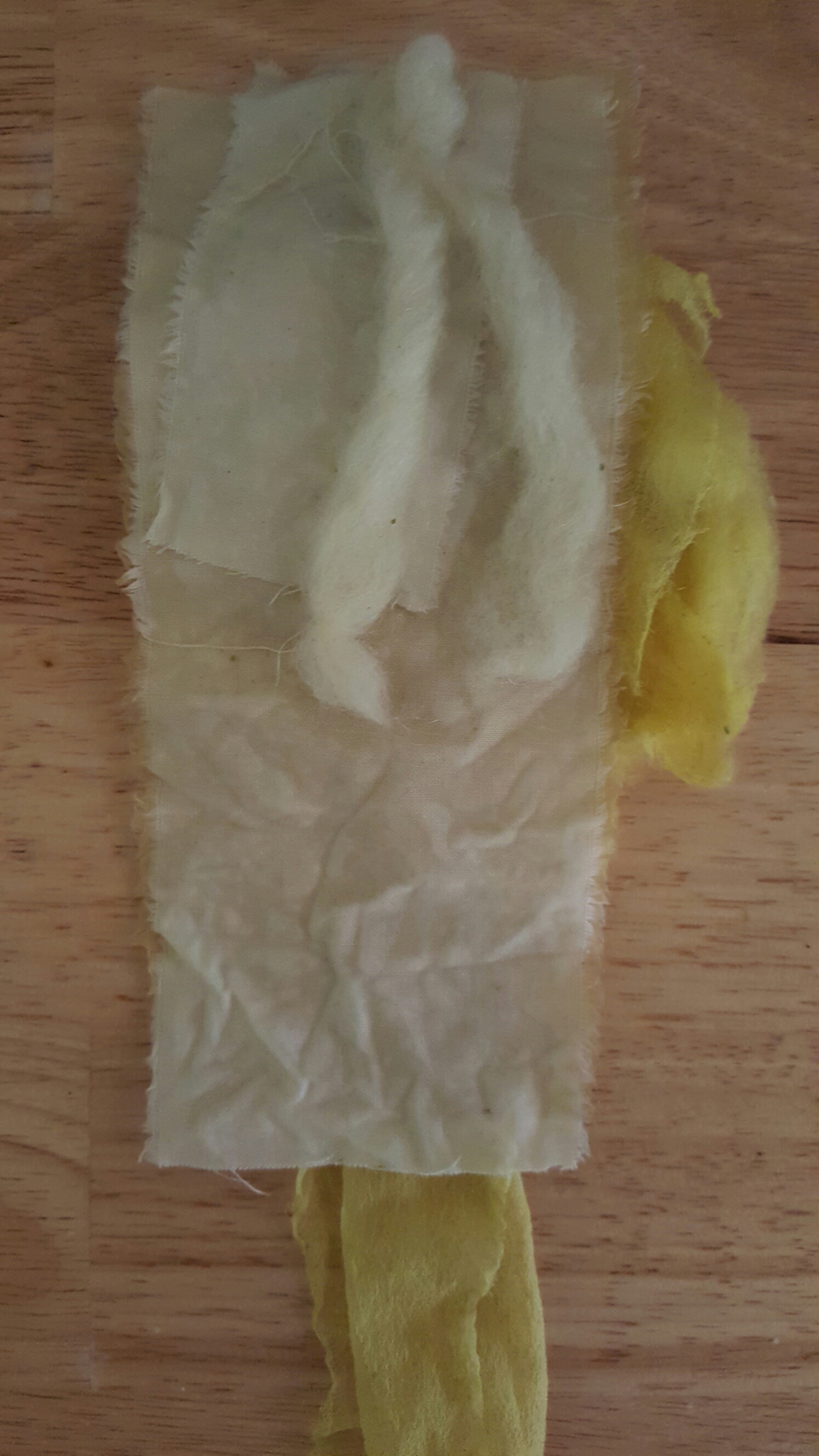 Each swatch had a piece of cotton with no mordant, cotton with an alum and cream of tartar mordant, cotton with a tannin mordant, silk with an alum mordant, roving with an alum and cream of tartar mordant and yarn with no mordant.